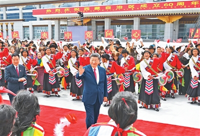 习近平离开西藏时,各族群众纷纷来到拉萨市区的沿途道路两旁,挥舞红旗、手捧哈达,欢呼着向总书记问好,向总书记表达由衷的爱戴。拉萨贡嘎机场,身着节日盛装的干部群众挥舞着红旗和花束,载歌载舞,高喊“扎西德勒”,表达高原儿女对以习近平同志为核心的党中央的感激之情、对建设社会主义现代化新西藏的坚定信心。